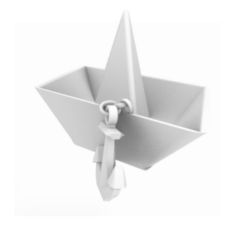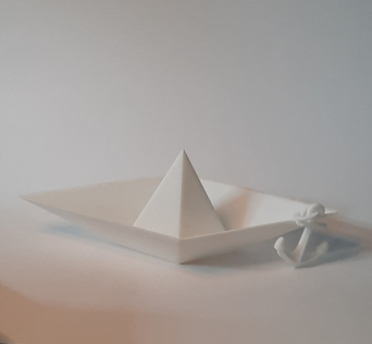 Het maken van een SLS product. Oefening in het ontwerpen van een commercieel product terwijl deze een bepaalde link heeft met elkaar. Zoals een live hinge. Ik koos voor de ankerketting op een papierenbootje. geprint als een leuk bureau accessoire. ( Geprint door Shapeways. Materiaal PA-12)